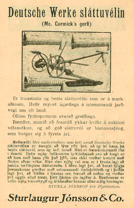 Til enn meira gamans og til að setja þennan texta í samhengi við það tæknistig sem bændu bjuggu við á þessum tíma er í þessari sömu handbók birt auglýsing um bestu sláttuvélina á markaðnum á þessum tíma: